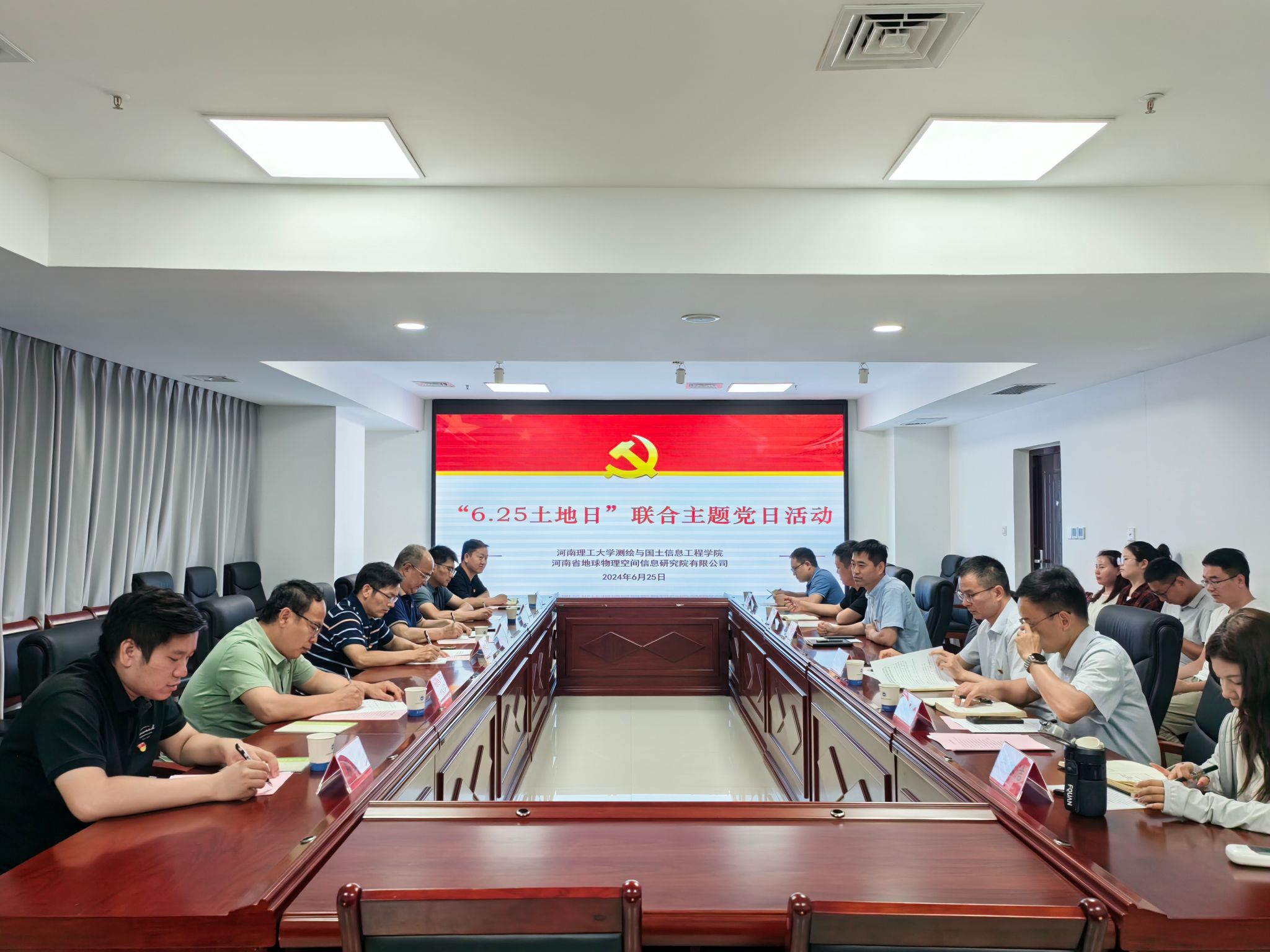 为深入学习贯彻习近平新时代中国特色社会主义思想,进一步推进党建活动与业务工作的深度融合、相互促进、同频共振,在第34个全国土地日来临之际,6月25日下午,土地资源管理系党支部与河南省地球物理空间信息研究院有限公司(简称空间信息院)规划设计中心党支部、信息中心党支部联合开展“党建+土地日”主题党日活动。土管系党支部书记傅建春、系主任王锐和党员代表参加,九三学社社员李明秋教授应邀出席。