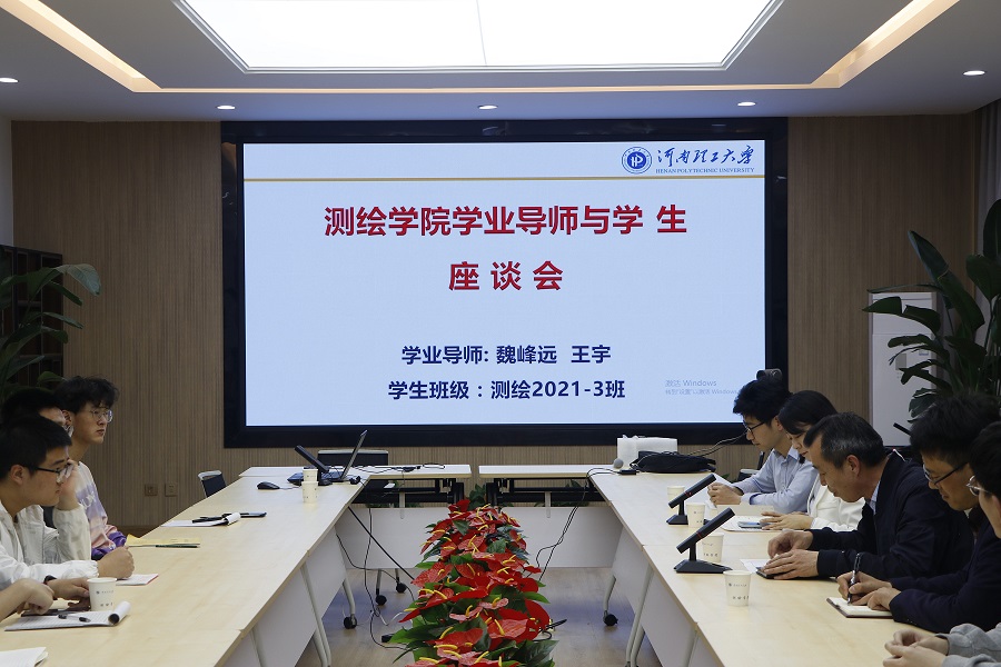 魏峰远院长在学院二楼会议室与指导的测绘类2021级3班学生亲切交流。参加座谈会的有动画疯