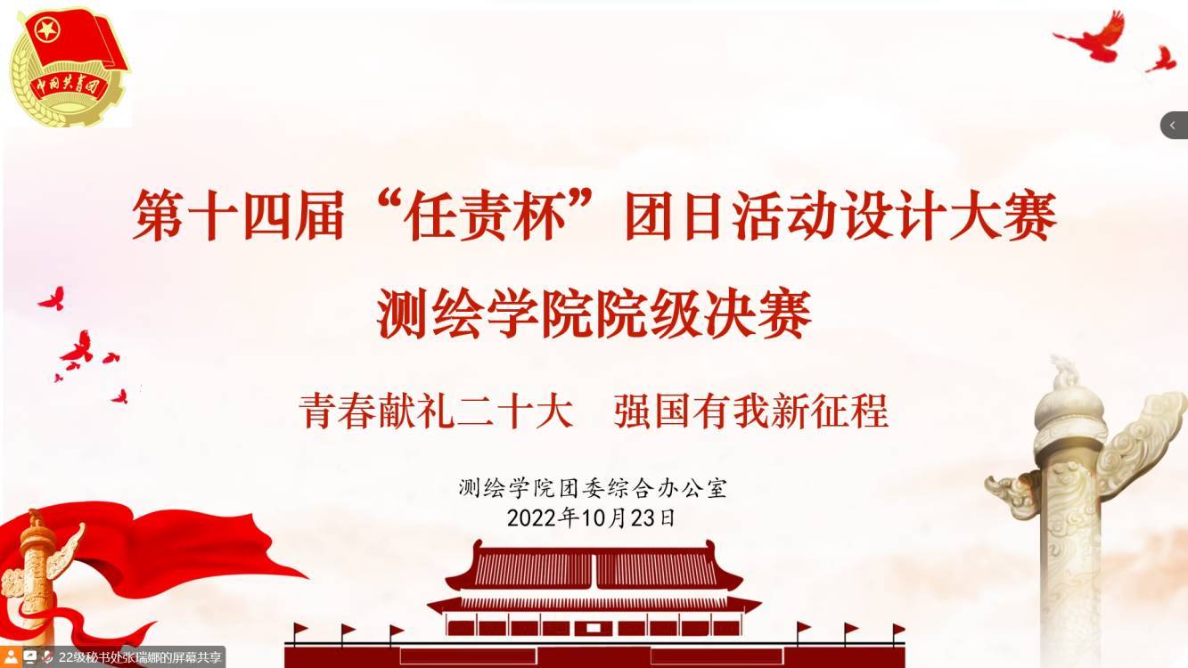 此次团日活动设计大赛的主题是“青春献礼二十大,强国有我新征程”。各团支部精心策划、充分准备,精心制作PPT并认真讲解,充分展现出各团支部丰富的活动内容和灵活的活动形式,主要有祝福视频拍摄、诗歌征文、辩论赛、知识竞赛、演讲比赛、折纸艺术、调查问卷、校园维洁,校园接力跑等等。比赛过程中,评委们细心聆听各团支部的讲解,针对性提出问题、给出改进意见。最终城乡2201团支部获得大赛一等奖,自环2202 、测导2204团支部获得二等奖,遥感2201等6个团支部获得三等奖