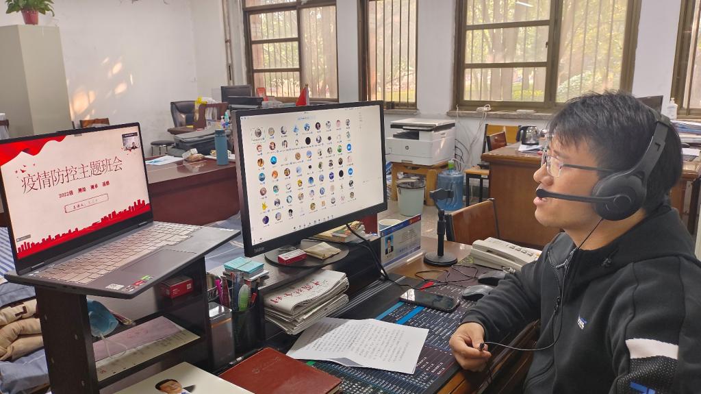会上,辅导员和班主任老师带领同学们学习近期学校疫情防控相关政策,如在学校封闭管理期间“非必要不出校”,确保完成“两天一轮”核酸检测,取消堂食以减少同学们在公共区域聚集,禁止人员翻墙出入学校,禁止隔墙递送物品等;结合当前疫情形势,强调要进一步加强疫情防控教育,自觉在公共区域佩戴口罩,养成合理膳食、适量运动等健康生活方式,科学普及防疫知识,要求同学们自觉遵守各项疫情防控规定和学校疫情防控相关政策。在线上教学常态化的情况下,老师要求同学们认真听讲,注意课堂质量,自觉高质量进行学业学习;开展“携手战疫”学生感言征集活动和宿舍抗疫短视频活动,紧扣疫情防控主题,传递青春正能量,为全面落实动画疯