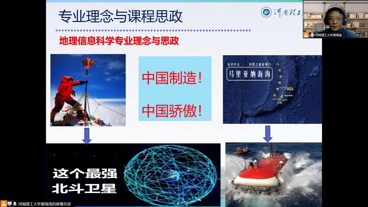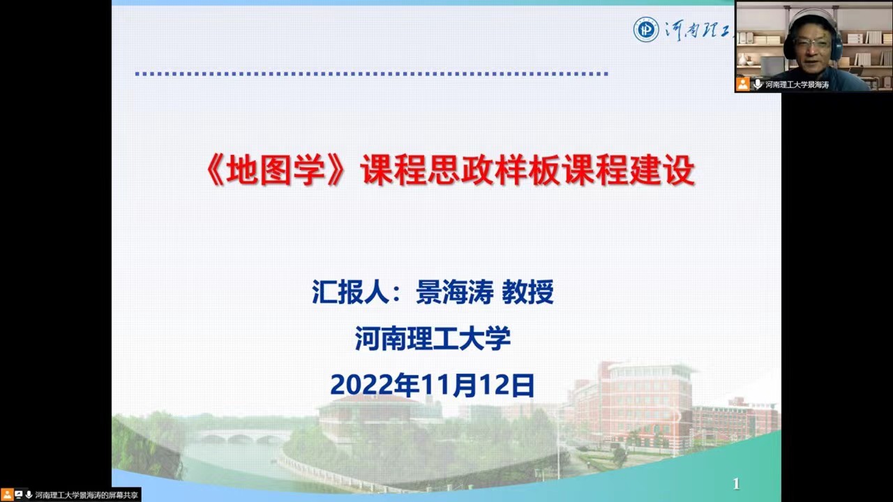 相关专业教师在线参加专题研讨并踊跃发言。在“地理信息科学专业课程思政建设研讨会”专题中,景海涛教授做了题为“《地图学》课程思政样板课程建设”的专题报告,以河南省首批课程思政样板课程《地图学》为例,从专业理念与课程思政、地图学课程思政、课程思政实验案例库建设等方面介绍了动画疯