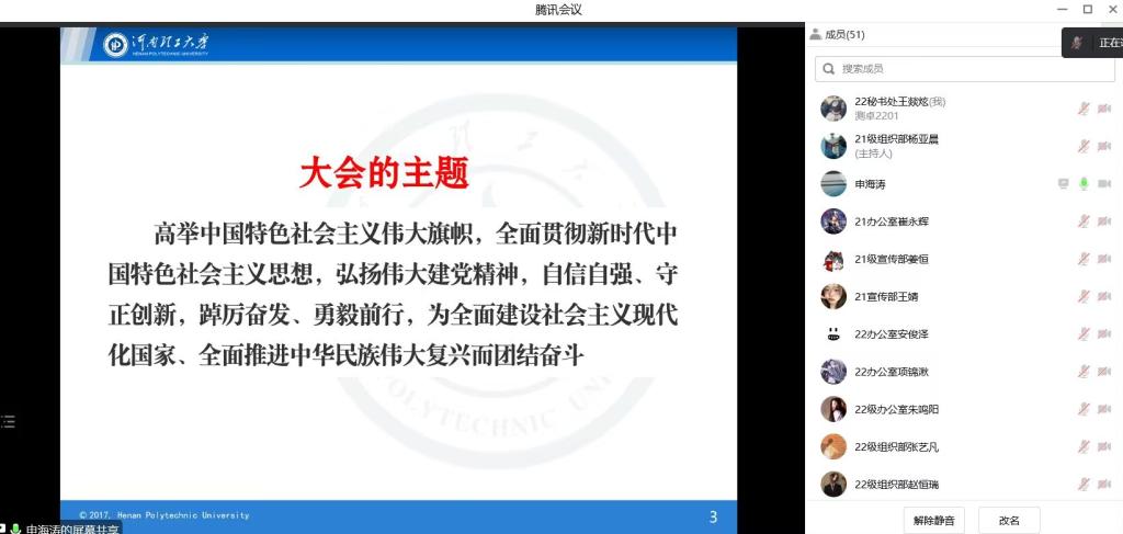 团委于11月27日晚在线上举办学习党的二十大精神专题报告暨“青马工程”培训班第三次理论学习,邀请省委宣传部青年理论宣讲专家申海涛老师做党的二十大精神宣讲报告。院团委书记李静主持报告会,学院“青马工程”培训班全体学员和动画疯