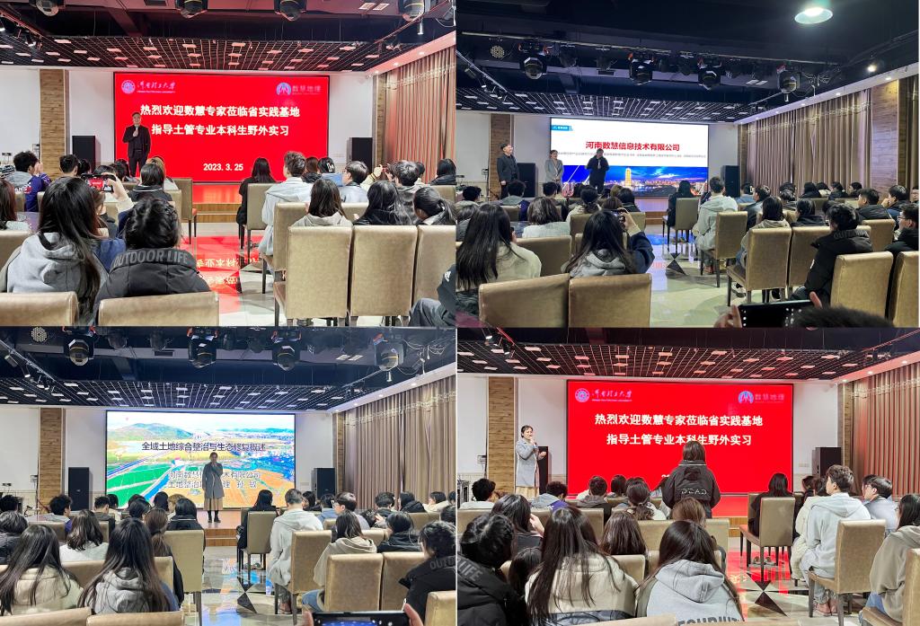 实习期间,特邀请省校外实践基地合作单位河南数慧信息技术有限公司新乡分公司的杜习岩经理和孙敏项目经理全程参与对学生野外实习的指导。在实习间隙,杜习岩经理围绕“数慧地理、行业应用、服务能力、动画疯”等四大模块详细介绍了公司的基本情况,促进了学生对数慧公司的了解;孙敏经理以“全域土地整治与生态修复概述”为题,从整治项目概述、资料收集、内业分析、项目调研、经典案例等六大方面为学生们进行了生动、详细地介绍,加深了学生对全域土地综合整治的理解,丰富了本次实习的内容。