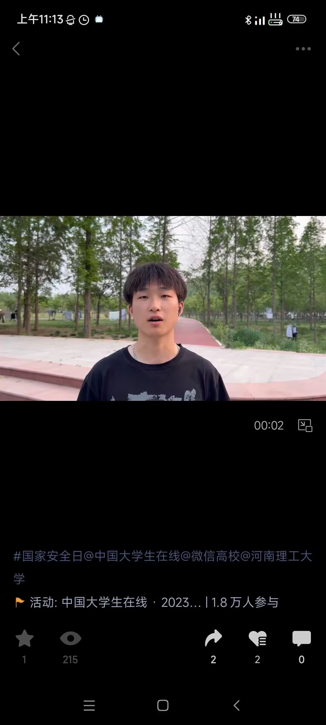 本次活动以“挺膺担当时代新人,共筑国家安全防线”为主题,学生通过关注微信视频号“@中国大学生在线”后进入动画疯“2023全民国家安全教育”活动专题,添加话题#国家安全日,并@中国大学生在线@微信高校@学校官方及师生友好账号后发布原创主题短视频,参加话题接力。