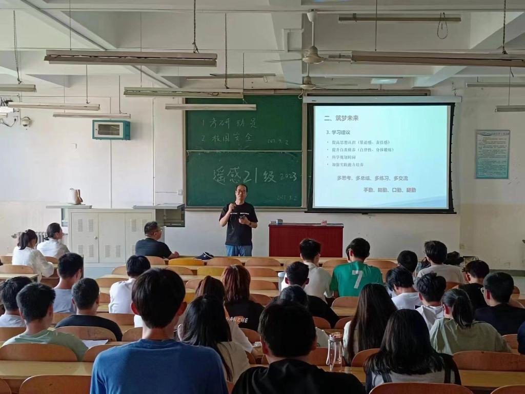动员会上,成晓倩老师总结了上学年工作,安排了新学期计划,鼓励大家要加强学风建设,珍惜大学时光,严格要求自己,稳步成长成才。马超老师详细介绍了遥感专业现状,分享了遥感技术的前沿发展和应用案例,鼓励同学们要进一步深造,积极投身科研。赵宗泽老师对新学年的规划提出了要求,他强调,同学们要养成良好习惯,科学分配时间,统筹安排好考研课程和日常课程学习,做到考研和常规学习两不误。最后,拓海燕老师嘱咐同学们要和睦相处,团结互助,诚实守信,在刻苦学习的同时要注意校园安全。