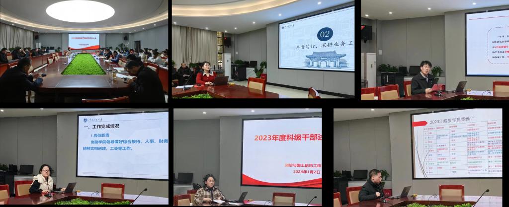 在测绘楼101会议室举行了2023年度科级干部述职评议报告会。学院全体教职工参加会议,会议由学院党委书记张红霞主持。