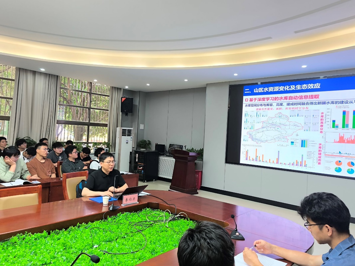 李均力研究员深入浅出地为大家讲解了遥感监测评估山区水资源变化及生态效应的意义,重点介绍了冰湖、冰川、湿地、耕地、果园、胡杨等地类的遥感智能提取技术,并将其用于灾害预警、绿洲水资源利用及结构优化、荒漠生态系统对生态输水的响应等研究。李均力指出,荒漠河岸带植被在维护干旱区的生态稳定起到重要作用,并以胡杨林恢复与生态输水关系为例,详细地讲解了研究思路、研究方法、研究进展。他强调,新疆作为干旱地区典型代表,其水资源与生态效应还有许多值得研究的地方,欢迎同学们开展相关科研工作。