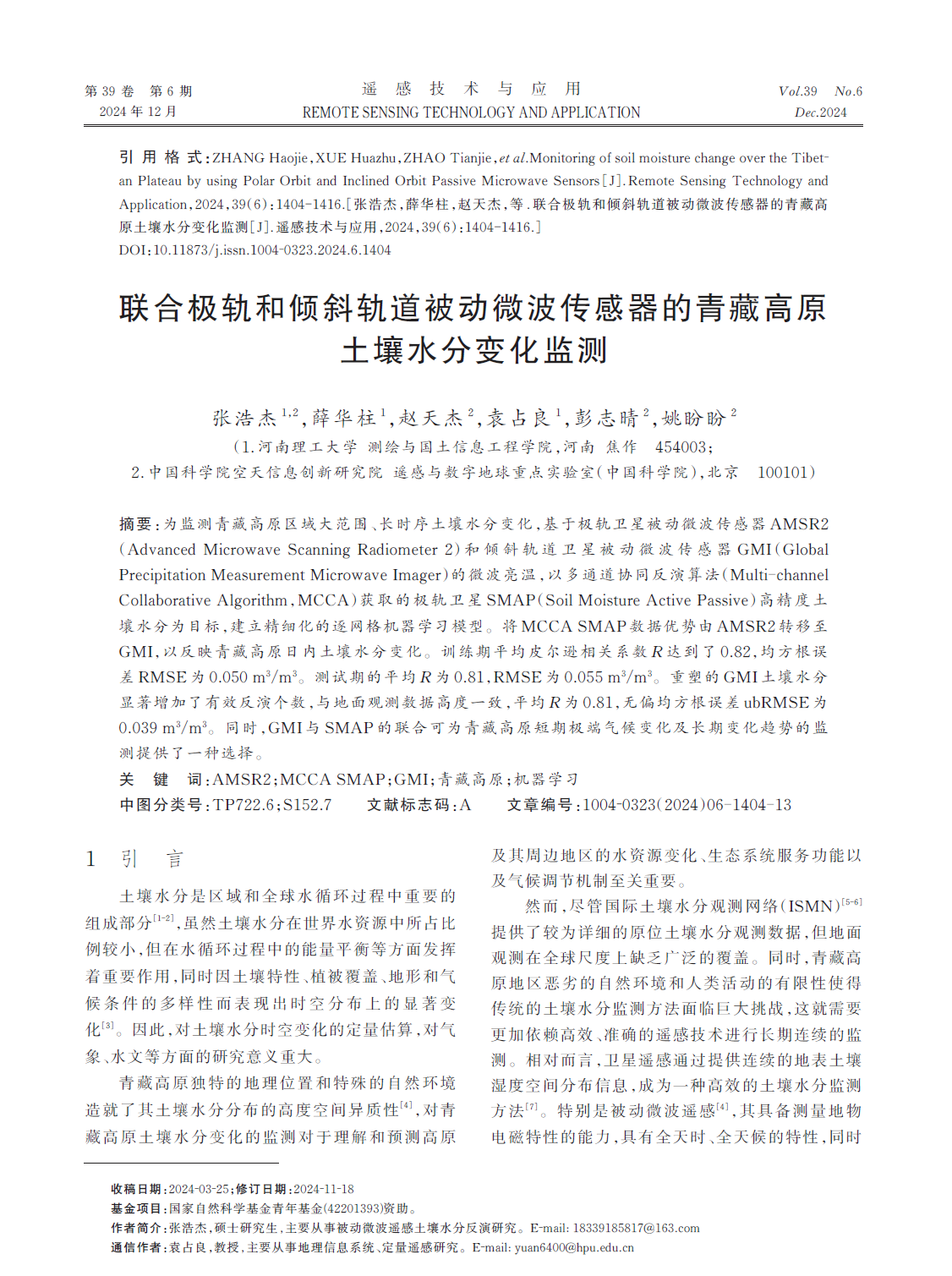 2021级测绘科学与技术硕士生张浩杰以第一作者身份在CSCD核心期刊《遥感技术与应用》(2024年第6期)发表题为《联合极轨和倾斜轨道被动微波传感器的青藏高原土壤水分变化监测》封面论文。论文通信作者为动画疯