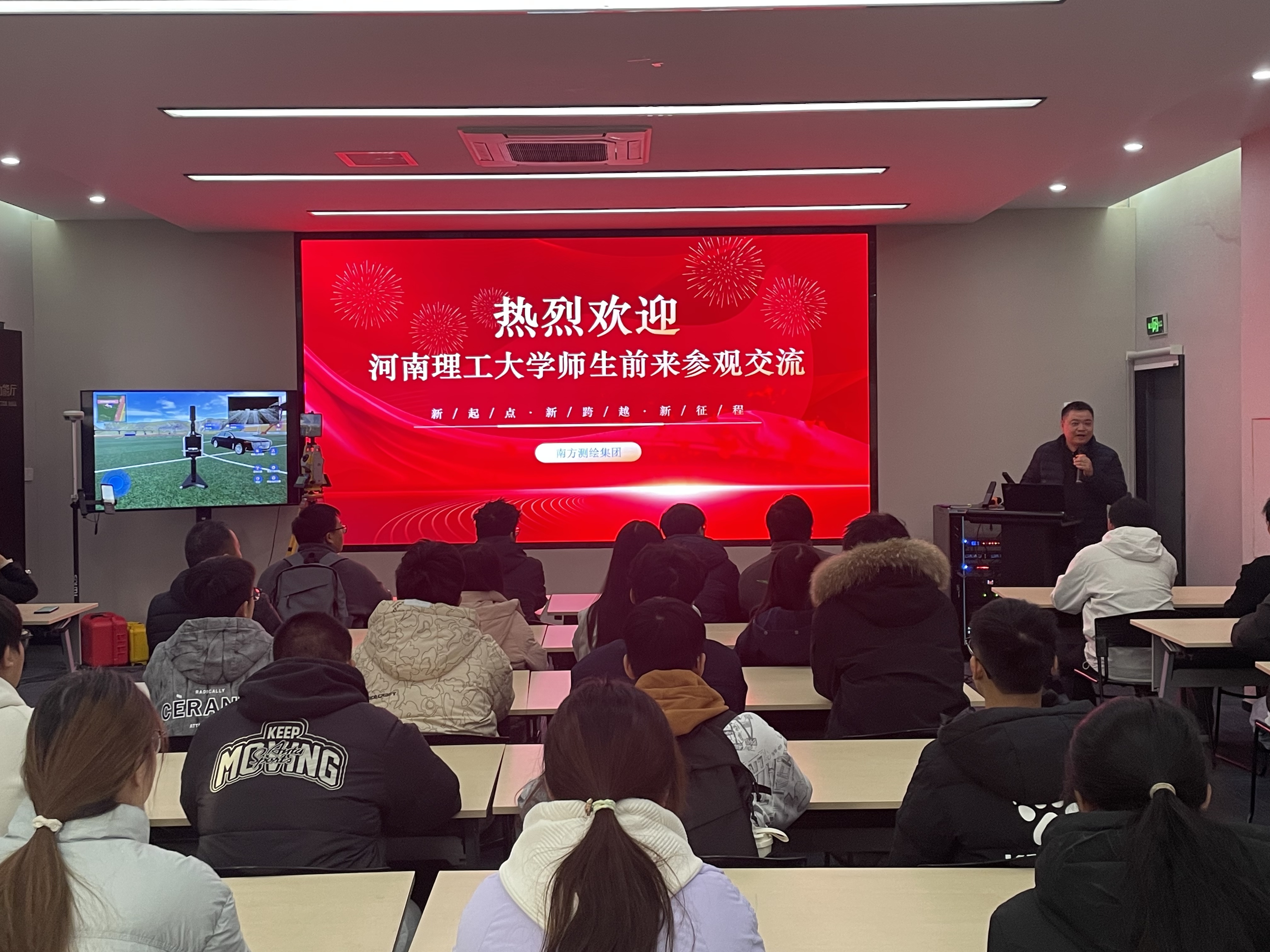 在企业展厅与研发车间,师生们紧随技术人员的脚步,先后观摩了北斗高精度定位、亚米级卫星影像实时处理、无人机三维建模、自然资源遥感监测等全流程演示。一张张灾后快速对比图、一组组夜光遥感经济活力数据,让“全球数字底座”的概念瞬间可感可知。企业专家现场拆解“样本标注—模型训练—知识图谱生成”技术闭环,使学生直观理解“数据、算法、算力”如何转化为治理效能,也为后续座谈研讨奠定了共同语境。