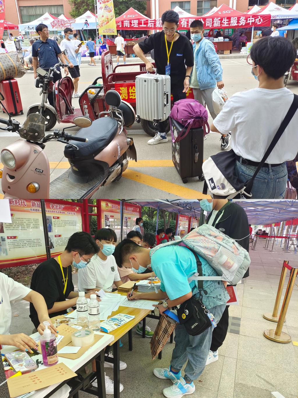 活跃在校园里的各色“马甲”是今年迎新现场的一道亮丽风景线。校门入口、摆渡车候车点、院系报到处、学生公寓区等地,志愿者们“严阵以待”,“冲”在最前,他们分工明确、有条不紊地迎接新同学,测量体温、收集健康登记卡、发放新生入宿凭证、录入新生报到信息,一切井然有序。因疫情防控需要,迎新志愿者们在帮助新生做好消毒和体温检测工作的同时,为解决新生家长不能随学生进入校园搬运行李的难题,志愿者们还在各校门服务点增设行李搬运服务。酷暑的余温还未散去,但是热情的笑容、高效的行李运送、耐心的流程指导,忙碌却温馨的场景让第一次远离家乡进入大学的新同学们感受到了理工大的温暖。