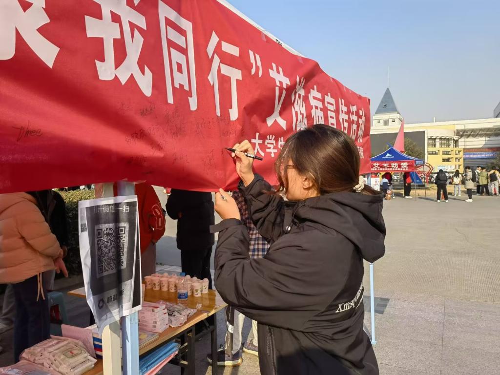 本次活动采用了线上和线下两种方式,同时结合了趣味抽奖。同学们通过参与线上知识竞赛答题,了解了艾滋病的基本知识和预防措施。同时,通过线下回答志愿者提问,参加套圈或者乒乓球过河等游戏。此外,志愿者们还在活动场地周边发放防“艾”宣传手册,邀请同学们在横幅上写下寄语并签名。参加活动的同学们纷纷表示,此次活动让大家在轻松愉悦的氛围里学习了有关预防艾滋病的知识。
