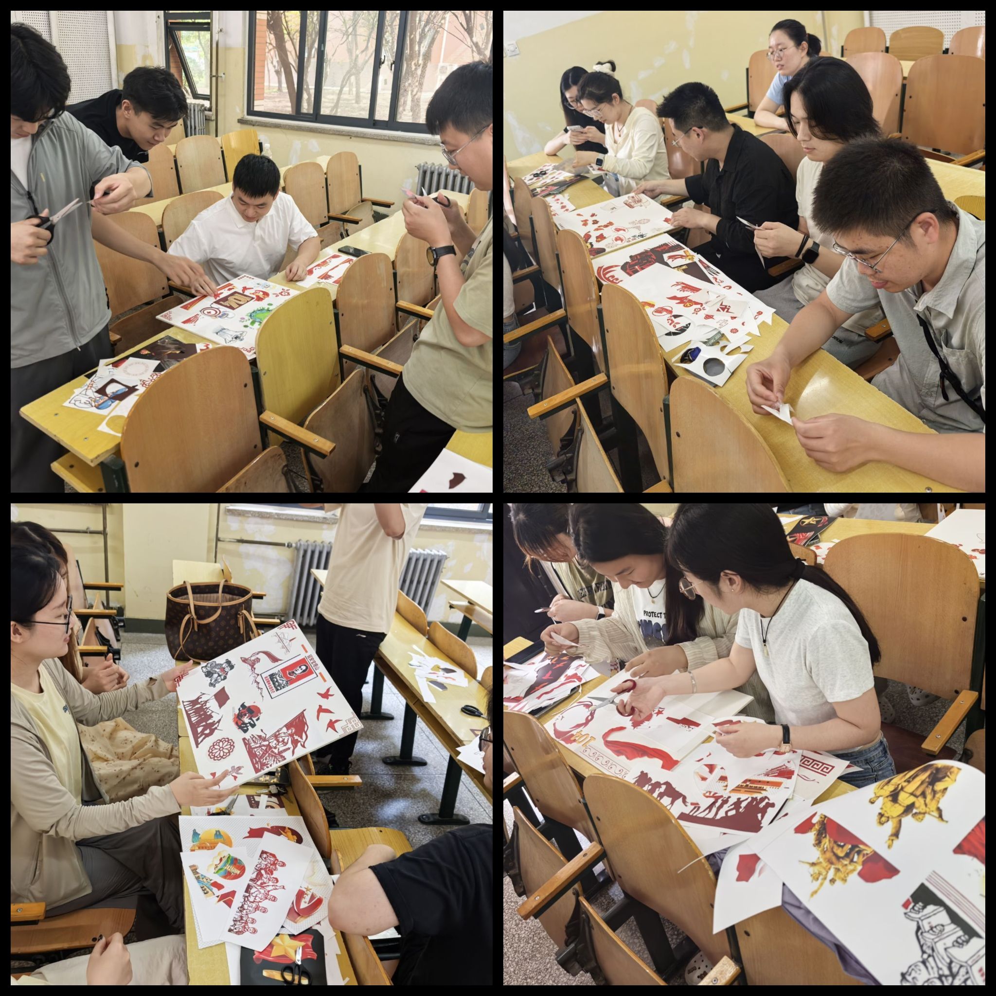 本次活动采用创意剪贴画拼图的形式,鼓励大家根据自己的理解进行创作。秦何详细介绍了活动背景、目的及流程,对红船精神、长征精神、延安精神等主题精神进行了简要讲解,分享了相关历史故事与感人瞬间,为同学们的创作提供了思路。创意制作环节中,同学们结合自己对于红色精神的理解,充分发挥想象力和创造力,将各种元素巧妙组合、拼贴在展板上,形成了一幅幅完整且富有创意的作品。最后,各小组依次将完成的作品展示在指定区域,并选派代表对作品进行讲解,分享创作思路、设计亮点以及对主题精神的理解与感悟。
