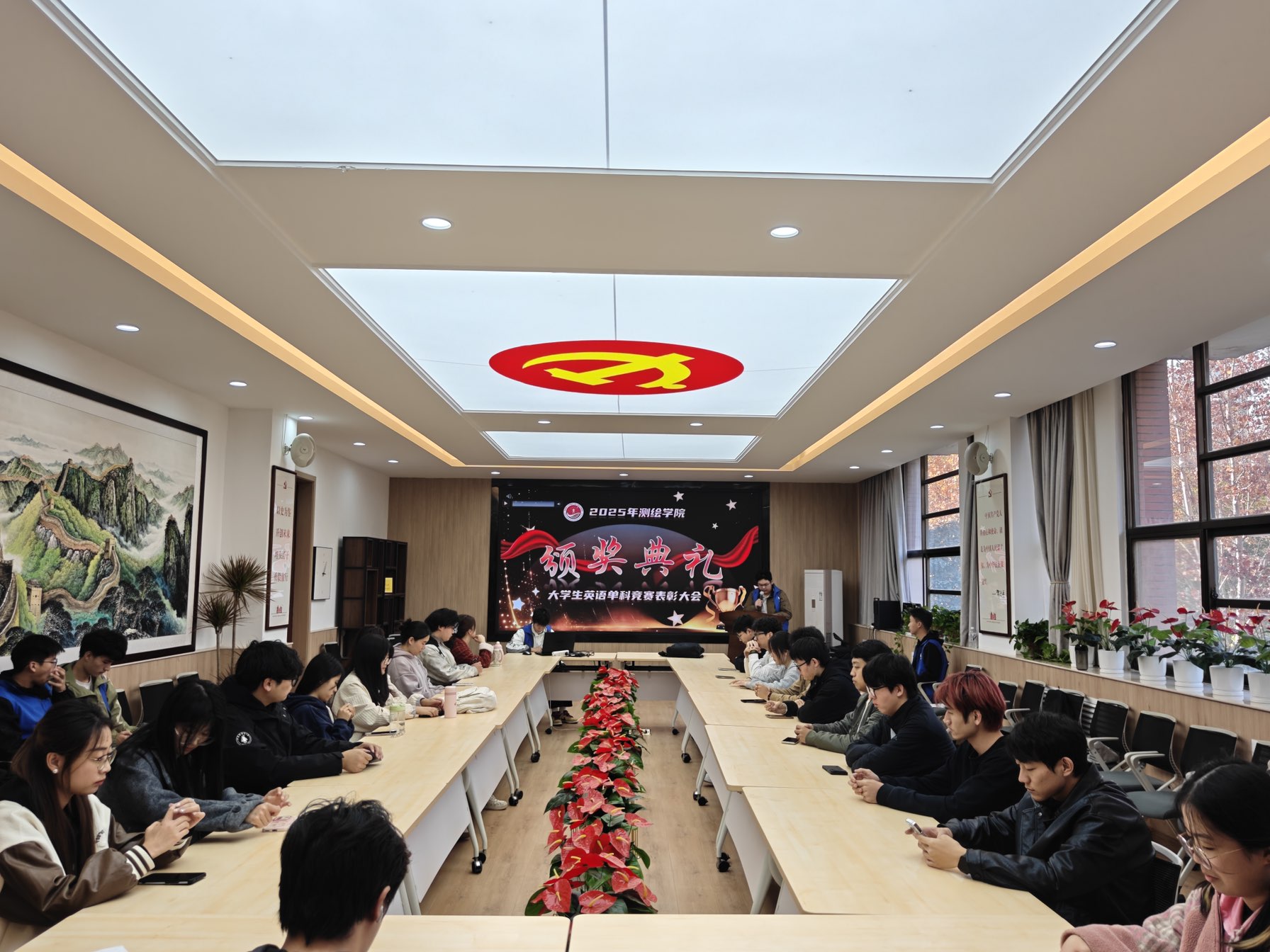 会议伊始,主持人张睿宣读了竞赛获奖人员名单。本次竞赛覆盖23级、24级多个班级,经角逐,赵远飞等3名同学获得一等奖、张凯迪等9名同学获得二等奖、刘珂华等10名同学获得三等奖。测卓2301班、地信2401班凭借班级整体表现分别斩获团体二等奖和团体三等奖。随后获奖学生上台领取证书,主持人表示:“这些获奖同学用扎实的英语基础,为全院树立了榜样。他们的成绩不仅是个人的荣誉,更是学院学风建设的生动体现。”
