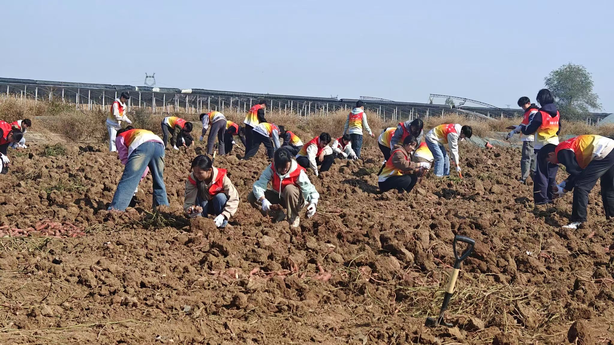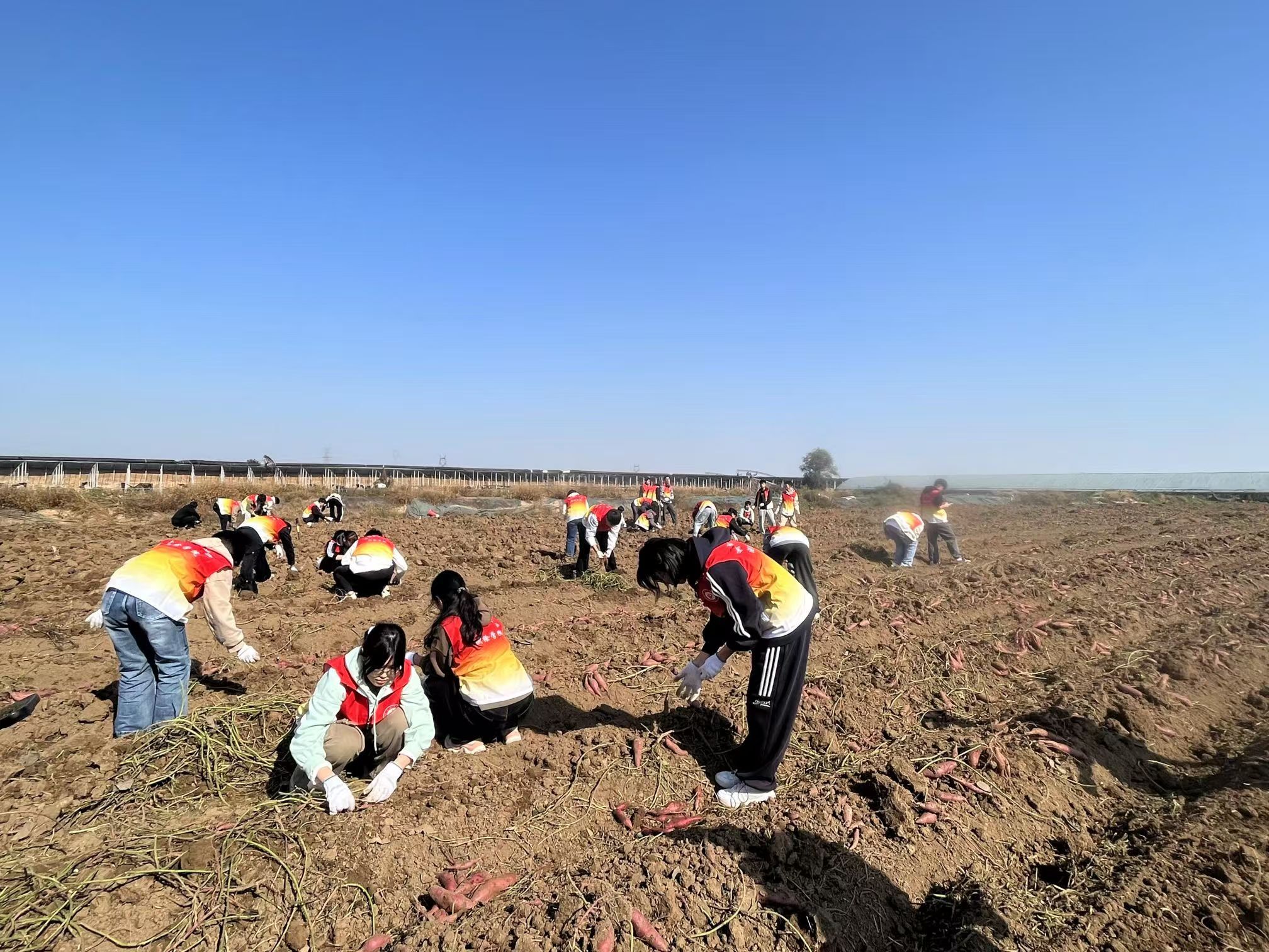 在老农民种植专业合作社,心有灵“硒”团队深入到火龙果、蟠枣、萝卜等富硒农产品种植区,发挥专业优势,通过现场指导、示范操作、咨询交流等方式,为富硒产业从业者提供种植技术指导和咨询,帮助他们提高富硒生产技能和田间管理水平,助力园区农产品的富硒含量和品质提升。之后,志愿者们来到富硒农产品红薯基地,在合作社农业技术人员的指导下,戴上手套,开始了“挖-捡-装”红薯“大工程”,大家分工明确,密切配合,干劲十足,忙得热火朝天,在大家齐心协力的努力下,成片的红薯采挖完毕。结束之时,园区工作人员对志愿者们的出色表现赞不绝口,并为志愿服务的师生分享了收获的喜悦——热气腾腾的富硒蒸红薯。