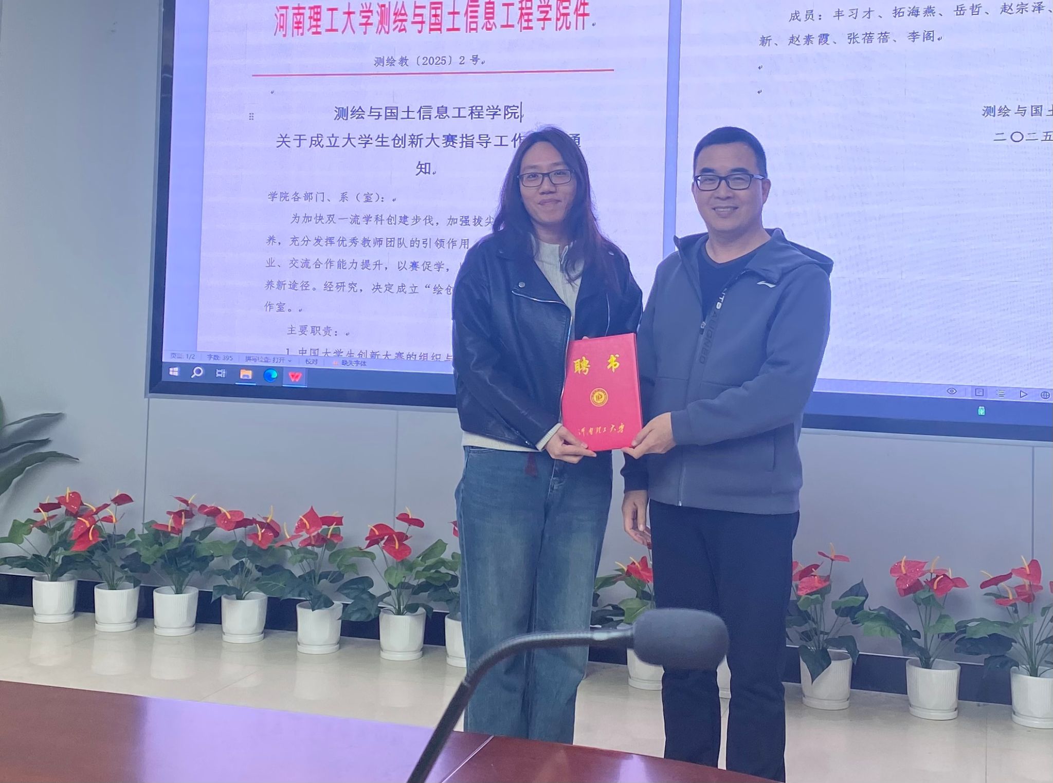 “绘创行”大学生创新大赛指导工作室成立文件,明确工作室的管理章程。袁占良院长为成晓倩老师颁发大学生创新大赛指导工作室主任聘书,指出学院对工作室的成立高度重视,鼓励其积极发挥平台作用,利用自身优势,整合竞赛资源,通过组织师生参加比赛和培训,提升教师的赛事指导水平,提高学生的创新创业能力,加快双一流学科创建步伐。