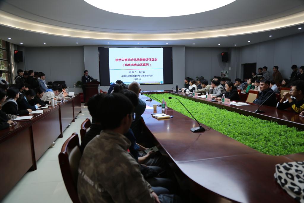 师生作学术讲座。彭建教授基于综合自然地理学视角,从空间集成概念内涵、阶段特征和前沿方向三个方面,深入浅出的阐述了综合自然地理学空间集成的理论方法及发展趋势,助力美丽中国建设,并分享了研究团队近年来取得的一系列研究成果。高江波研究员以北京房山试点为案例,以理论知识服务国家灾害风险防控为落脚点,介绍了自然灾害风险概念与评估框架,减灾能力评估模型,单灾种、多灾种灾害风险区划与集成技术与方法,灾害防治精细化对策方案等方面的内容,特别强调,要把研究工作与人才培养连接起来,夯实理论基础,服务实际应用,形成复合型创新人才培养体系。自由讨论环节,彭教授和高研究员认真细致地解答了师生的困惑,并与师生就报告内容进行了热烈讨论,现场气氛活跃。