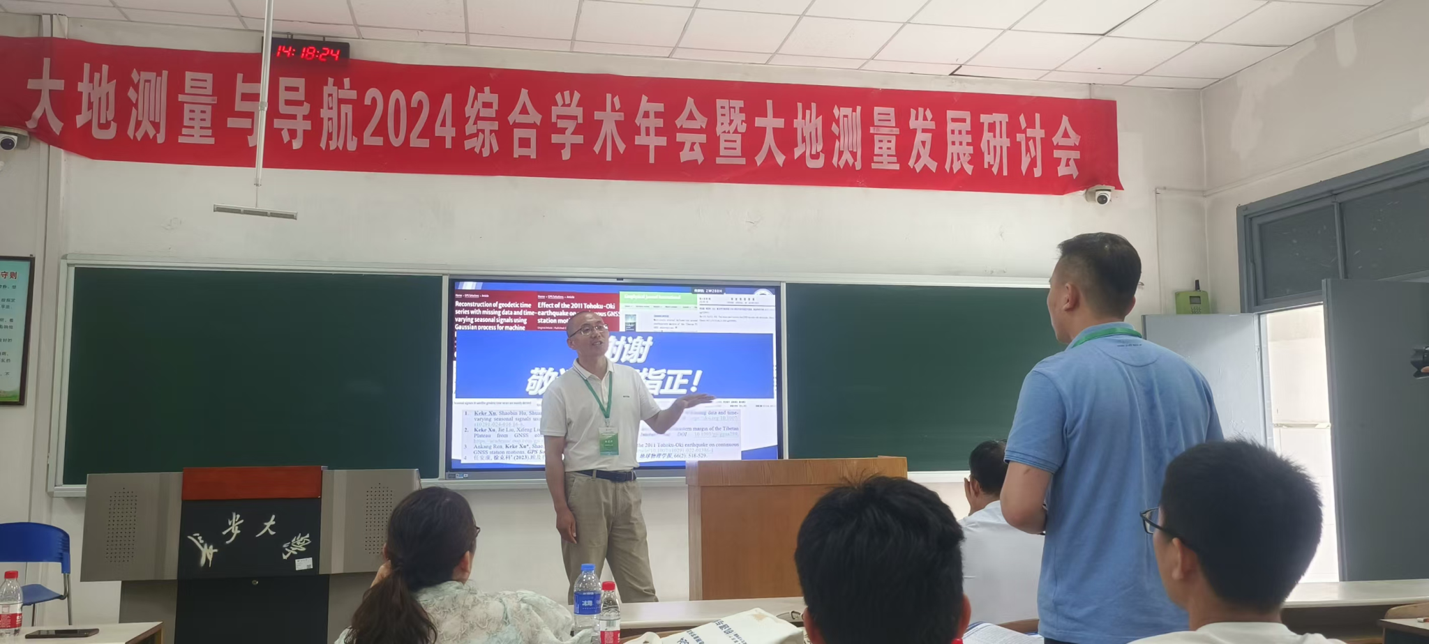 大地测量与导航专业委员会委员徐克科教授受邀在大会上作“GNSS观测时序构造形变的高斯过程估计”主旨报告。张子豪等3名硕士研究生参加了海报展示环节。